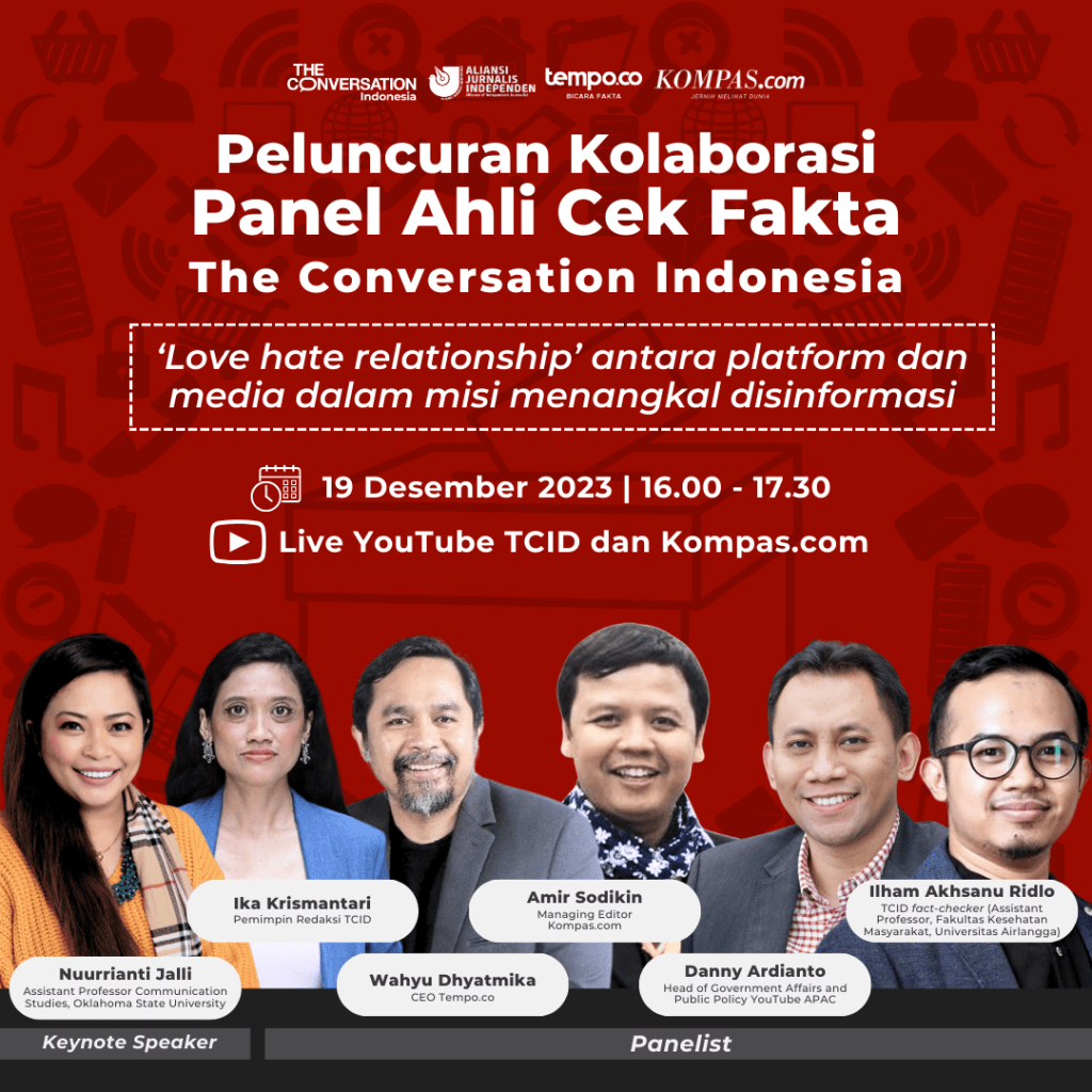 The Conversation Indonesia (TCID) mengantisipasi polarisasi politik dan penyebaran informasi palsu pada Pemilu 2024 dengan membentuk relawan panel ahli pemeriksa fakta dari berbagai bidang.